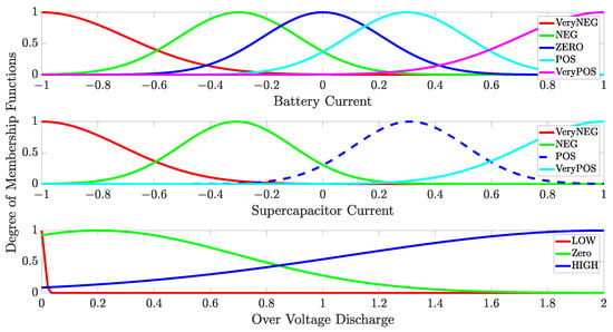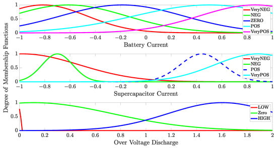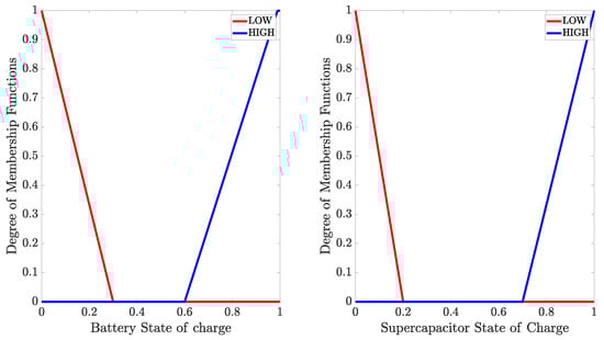 Moreover, Figure 7 shows the membership functions associated with the state of charge (SOC) of the battery and supercapacitor, respectively. The SOC of the battery and ultracapacitor are treated differently since they have two distinct objectives: “low” and “high”. Although it may seem that these functions do not cover certain sections of the axis, it is essential to note that the “NOT” operation of each membership function is considered in the rule base so it can cover the entire range between 0 and 1.