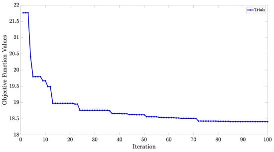 To design the PSO-based fuzzy controller, we utilized the PSO algorithm to optimize the parameters of the fuzzy controller. The convergence diagram of the PSO algorithm is plotted in Figure 9 to illustrate how effective the algorithm is at optimizing fuzzy controller parameters. To provide a comparison between the fuzzy membership functions before and after optimization through PSO algorithm, these results are shown in Figure 8 and Figure 10.