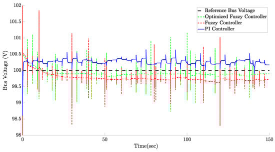 One of the main objectives of this research is to minimize the voltage ripple in the main bus. In this section, we will explain this objective further to demonstrate the effectiveness of our proposed controller compared to the two other controllers. The voltage ripples of the system in the presence of three introduced controllers are shown in Figure 12. As can be seen from this figure, the regular fuzzy controller is the most inefficient in ripple minimization. By comparing the performance of the two other controllers with the dashed black line, which represents a 100-volt reference, it becomes apparent that our proposed controller performs better. Furthermore, we will report the integral of absolute error for these three methods in Table 3 to quantitatively compare their effectiveness in minimizing voltage ripples.