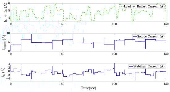 The rapid energy transfer between critical components is demonstrated in Figure 16, facilitating swift recharge and reducing the risk of undercharging and damage, especially to the battery. Notably, this process does not significantly alter the charge level of the components. Conversely, when the battery is fully charged and the supercapacitor is depleted, energy redirection occurs, effectively reducing system ripples through supercapacitor operation and lowering battery activation frequency; while immediate outcomes may not be evident, a comparison of total current drawn from the battery across controllers highlights the approach’s efficacy in achieving objectives.