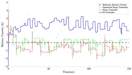 Our proposed controller aims to optimize the utilization of the EV battery by reducing its activity. This approach leverages the supercapacitor’s shorter charging and discharging times, allowing it to compensate for most short-term changes in system load and voltage ripples. As a result, the system bandwidth is significantly enhanced due to the fast responses to the effects of load and source changes on the bus voltage of the DC microgrid. Moreover, this strategy reduces the wear and tear on the battery from frequent use compared to the supercapacitor. The supercapacitor is also more cost-effective and easier to replace within the system than the EV battery. The flow of current for the battery, supercapacitor, and stabilizer are important, and have been shown in Figure 13. In this figure, by comparing the middle figure with the bottom one, we can determine when the battery, supercapacitor, or both are charging and when they are discharging. To illustrate how the system achieves this process, it is important to consider the total value of the battery current during operation, as shown in Figure 14. Although it may not be evident in the Figure 14, when employing the PSO-based fuzzy controller, the current drawn by the battery is substantially lower than the total value of the two other controllers, as shown in Table 4. This reduction in current drawn by the battery demonstrates the effectiveness of our approach.