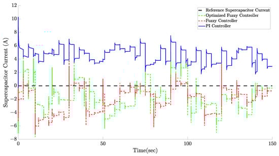 As shown in Figure 15, the value of the supercapacitor current increases due to its operation in attenuating most of the ripples in the DC microgrid. To determine which controller performs better, it is essential to consider both Figure 14 and Figure 15. This comparison helps identify which controller contributes more to reducing the battery current while also minimizing ripple in the DC microgrid bus voltage.