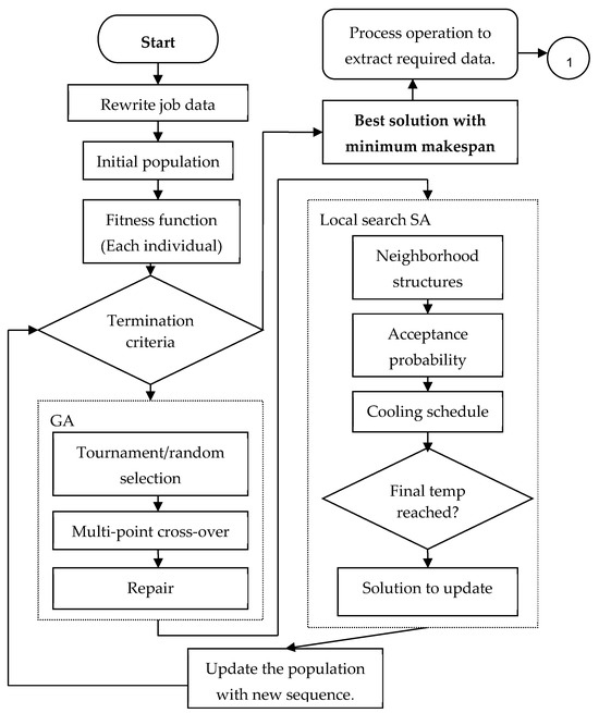 In this paper, a hybrid algorithm is used which includes the GA, SA, and the variable neighborhood search (VNS) algorithm. The SA is inserted into the procedure of GA for local searching. The GA can fall into the local optimal solution, which is why the proposed hybrid algorithm uses the local search algorithm, i.e., SA, to avoid being trapped in the local minima and accelerate the convergence speed. To diversify the solution, the VNS is used with SA with the aim to escape the local optimum and reach a global optimum. VNS works on the principle of using two or more neighborhood structures and systematically changing the neighborhood within the local search [35]. Figure 1 shows the workflow of the proposed hybrid algorithm. The following is a description of the GASA and VNS steps that are used in the proposed hybrid algorithm. The ‘1’ in Figure 1 flowchart represents the link between the scheduling and rescheduling methods allowing for retrieval of scheduling data for use in the rescheduling process.