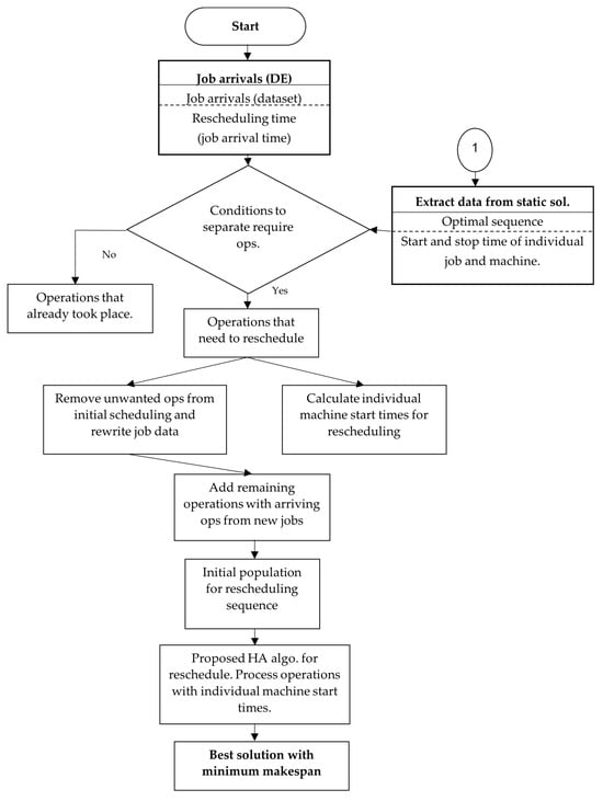 Figure 3 shows the workflow for the job arrival dynamic event. In this dynamic event, there can be the arrival of one or multiple urgent jobs. At the start of this method, the job arrival dataset and job arrival timing (i.e., rescheduling timing) are required. In the next step, we filter out all operations into operations that have already taken place and operations that need to be rescheduled with newly arrived jobs.