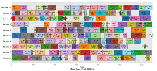 In Figure 4, a Gantt chart illustrates the scheduling solution for problem instance LA28. It displays 20 jobs allocated across 10 machines. Each color represents a specific job; for example, all green sections indicate job number 17. On machine 1, the green-colored section represents job number 17, indicated within brackets as (17,1,1) (75). Here, 17 denotes the job number, 1 signifies the operation number, 1 indicates the chosen machine option from the set of machines, and 75 denotes the processing time. The maximum completion time (makespan) for scheduling all operations is 1305 units.