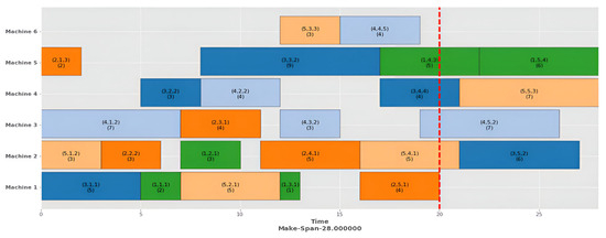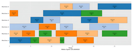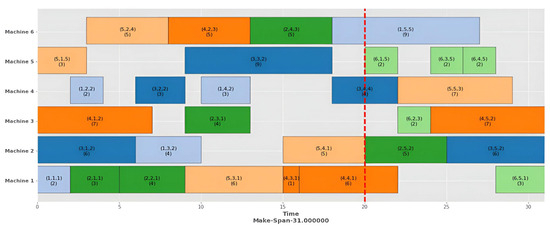 In this dynamic event, an urgent job arrives at a specific time. Table 6 shows the processing information of the arrival of a single job, i.e., job 6, consisting of five operations and six machines. The data from Table 4 are utilized for static scheduling. Job 6 arrives at a time of 20 units. Figure 7 shows a Gantt chart of the static scheduling of five jobs before job six arrives, with a makespan of 29. Figure 8 illustrates a Gantt chart of rescheduling after arriving at a new job without optimizing, with a makespan 37. After applying the proposed rescheduling HA strategy, the makespan is minimized to 31, as illustrated in the Gantt chart in Figure 9.