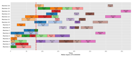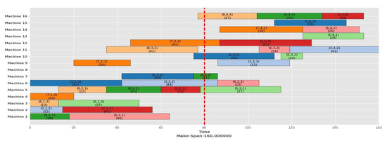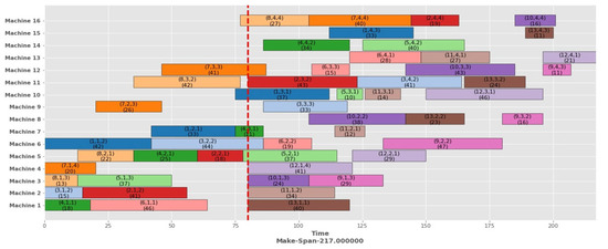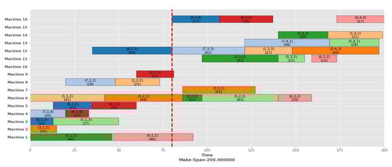 In this dynamic event, multiple machines become unavailable due to service or material unavailability. Then, multiple machines need to break down at a time. Specifically, machines numbers 5, 10, and 15 will be unavailable at the time of 80 units. Figure 10 shows a Gantt chart of static scheduling with a makespan of 163 units, and after rescheduling with the proposed HA, the makespan is 200 units, as demonstrated in the Gantt chart mentioned in Figure 11. Operations O52 and O73, which already started on the broken machine before the breakdown time, proceed again following rescheduling.