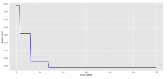 The proposed hybrid GASAVNS algorithm terminates when the number of generations reaches the maximum iteration value; in this study, the iteration value is set to 300, and we obtain the most feasible solution with the optimal makespan.