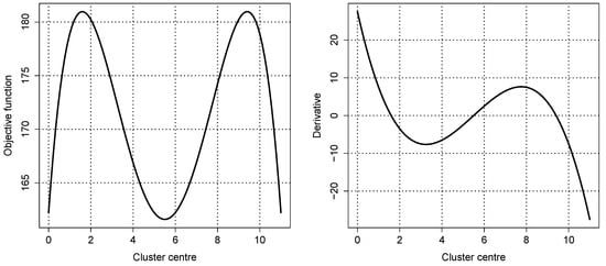 For Figure 2, was changed to the smaller, value . In this case, is too small, and the local minimum of the objective function vanishes while the two local maxima are joined together. The derivative has only one real root. Computing the membership degrees with the cluster centre at 5.5, Equation (13) yields partly negative values. In this case, Algorithm 1 would fail because it relies on three different real roots of the derivative of the objective function.