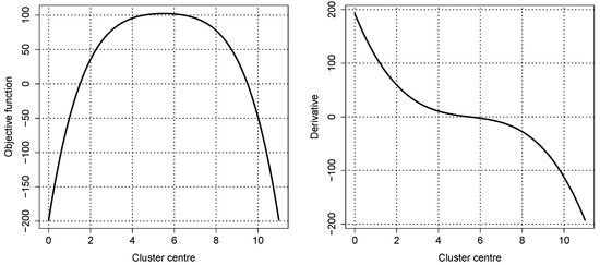 One can easily identify the two local maxima and the local minimum in between the objective function and the corresponding roots of the derivative. Due to the construction of the dataset, the local minimum of the objective function—the cluster centre—is at 5.5 and the curve is symmetric with respect to this point. In this case, is sufficiently large, resulting in only positive membership degrees.
