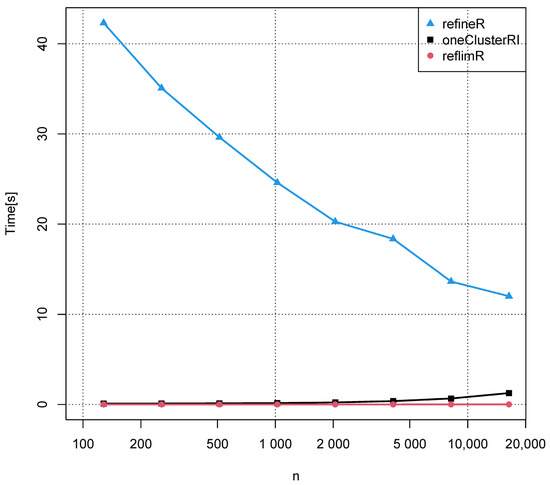 The method reflimR is the fastest one with less than one second of the computation time for all considered sample sizes, followed by oneClusterRI, also remaining below one second except for the largest sample size with a computation time of 1.3 s. The method refineR is more than a magnitude slower, especially for small sample sizes. The method refineR shows a seemingly counterintuitive behaviour concerning the computation time, which decreases with the increasing sample size. This can probably be explained by the complex statistical estimations used by refineR, leading to faster convergence for larger sample sizes that make the estimates more reliable.