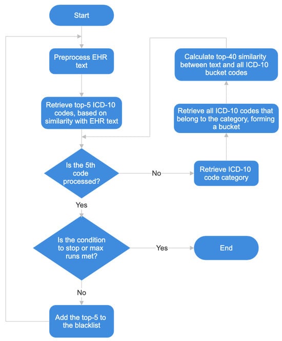As an example, let us consider the case where for a single run, the top-5 similarity, between the ICD-10 codes and a given EHR text, is “J17—Pneumonia in diseases classified elsewhere” (0.63 similarity), “R0602—Shortness of breath” (0.62 similarity), “P23—Congenital pneumonia” (0.58), “P239—Congenital pneumonia, unspecified” (0.54) and “J1289—Other viral pneumonia” (0.49). The word “pneumonia” has frequency ≥ 2 occurrences among the top-5, so it will be included in the blacklist, and in the next run it will not be used for similarity calculation. If it was not removed, then the word “pneumonia” would superimpose, making it difficult to encode other ICD-10 codes which are still present but have lower similarity scores because of the influence of the word pneumonia. In the second run, after the removal of “pneumonia”, the encoded top-5 is “R0602—Shortness of breath”, “J44—Other chronic obstructive pulmonary disease”, “J81—Pulmonary edema”, “J449—Chronic obstructive pulmonary disease, unspecified” and “J811—Chronic pulmonary edema”. The next run may add the word “pulmonary” to the blacklist, thus providing a way to possibly find other ICD-10 codes.