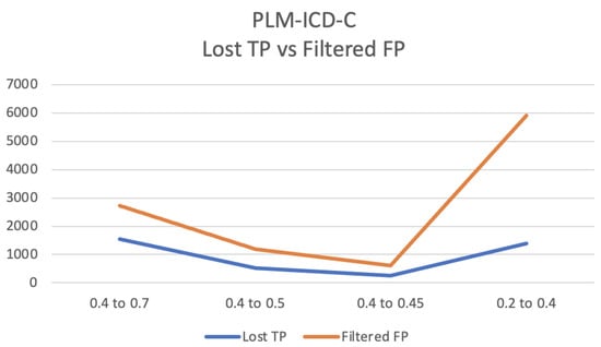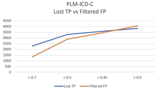 On the other hand, in the interval between and , with values of 0.7, 0.5, 0.45 for , and 0.4 for , the balance is positive, as it can be seen in Figure 4, where for the use of PLM-ICD-C, there is a loss of TPs inferior to filtered FPs. For value of 0.4 and value of 0.2, the balance is positive with a bigger margin.