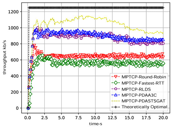 Therefore, within the scope of this research article, we introduce a novel multipath scheduling algorithm, namely PDASTSGAT (path diversity-aware spatial–temporal graph attention network), which leverages spatial–temporal synchronous graph convolutional networks [11]. It addresses the network scenario where packets of different sizes traverse the links by using a graph convolutional neural network to analyze the current state of the links in real time and allocate different-sized packets. This improves the utilization of link resources and enhances the throughput and stability of MPTCP links. The design objectives of PDASTSGAT are as follows: (1) Utilize graph attention neural networks to analyze packet sizes and link states and allocate transmission resources to the corresponding links, thereby enhancing link throughput. (2) Address fairness issues in link performance by distributing transmission resources appropriately and balancing the throughput of each link. We evaluated the proposed PDASTSGAT algorithm through simulations. The results demonstrate that when there are significant performance differences among links, PDASTSGAT outperforms scheduling algorithms such as round-robin, Average-RTT, Fast-RTT, and PDAA3C [12] in terms of transmission performance. It achieves throughput improvements ranging from 8% to 14% compared to PDAA3C. One of the characteristics of STSGAT is its ability to ensure subflow fairness by selecting the optimal subflow based on the current subflow quality and the learned experiences of the model when data packets need to be transmitted.