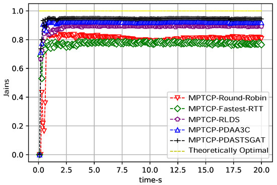 Figure 3 presents the simulation results of subflow throughput, wherein a comparison is made among the MPTCP-RLDS, MPTCP-round-robin, MPTCP-Fastest-RTT, MPTCP-PDAA3C, and MPTCP-PDASTSGAT algorithms. In the figure, the subflow throughput of the MPTCP-PDASTSGAT algorithm outperforms the MPTCP-PDAA3C algorithm by 8.6%, outperforms the MPTCP-RLDS algorithm by 8.9%, surpasses the MPTCP-round-robin algorithm by 49.6%, exceeds the MPTCP-Fastest-RTT algorithm by 52.6%, and approaches the theoretically optimal value of throughput. In the multipath transmission simulation experiment, PDASTSGAT selects the optimal path by combining packet information and the overall spatiotemporal characteristics of the links when transmitting data packets. Therefore, MPTCP-PDASTSGAT achieves higher throughput. We utilize the Jain fairness index to compare the fairness of the links [12]. Figure 4 presents a comparison of subflow fairness values among MPTCP-RLDS, MPTCP-round-robin, MPTCP-Fastest-RTT, MPTCP-PDAA3C, and MPTCP-PDASTSGAT. Due to the consideration of spatiotemporal data relationships during data transmission, MPTCP-PDASTSGAT exhibits slightly better subflow fairness compared to the other approaches.