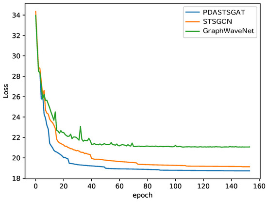 This article constructs a graph neural network model based on PyTorch. The cross-entropy loss function is used for loss calculation, and the Adam optimizer is employed to update the parameter matrices of the network. The learning rate is set at 0.003. The following figure presents a comparison of different approaches for model training. Graph WaveNet [17] incorporates two distinct modules to effectively capture spatial dependencies and temporal correlations in a separate manner, resulting in inferior training performance compared to STSGCN and PDASTSGAT. By introducing graph attention mechanisms, our model can achieve faster convergence.