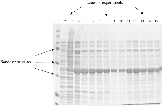 Among the techniques used to identify the presence, absence, or overexpression of proteins of biological interest, sodium dodecyl sulfate–polyacrylamide gel electrophoresis (SDS-PAGE) is present. This technique separates proteins by applying an electric field to the gel. The proteins move through the gel and are retained in different positions according to molecular weight. The gel is stained using Coomassie blue. Each of the samples analyzed is represented in columns (lanes), and the horizontal bands correspond to the proteins detected in each piece. Thicker bands indicate higher protein concentration [1] (see Figure 1).