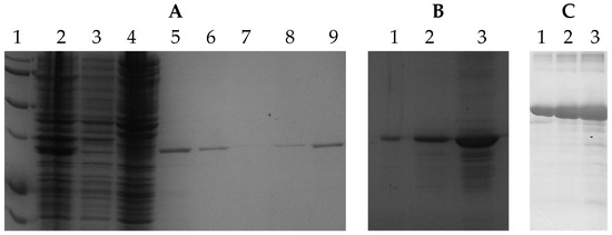 In addition, to obtain SDS-PAGE images from controlled concentrations, a dilution of bovine serum albumin (BSA) protein obtained from the Bio-Rad Protein Assay kit was prepared to get three samples with the following concentrations: 2 mg/mL, 1 mg/mL, and 0.5 mg/mL (lanes 1, 2, and 3, respectively, in Figure 2C). This experiment demonstrated that the methodology proposed here also achieves the set goal for other protein classes.