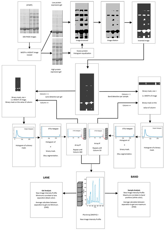 In this article, the methodology described in reference [30] is used to obtain different concentrations of pure GPN protein added to a bacterial cell extract to create SDS-PAGE gels. The incorrect or excessive expression of some proteins may be associated with an imbalance in health. So, this research produces gels representing patient samples with different amounts of protein expression, including absence and different levels of overexpression, to emulate various stages of Invasive Ductal Carcinoma (IDC) and Invasive Lobular Carcinoma (ILC) Her2+ breast cancer. Therefore, identifying specific proteins can be helpful in disease diagnosis. Examples of such proteins are GTPases, such as Rho, Rab27, and GPN, which have been linked to the development of breast cancer [31]. Reference [30], an article by the same authors as the present article, describes a new methodology for obtaining pure GPN protein in high levels in homogeneous form. In the current research, an algorithm was proposed for a new method to identify the lanes and bands of samples present in an SDS-PAGE gel and the molecular weight, to identify the overexpressed protein related to breast cancer. For that, the obtained images were analyzed using the newly developed image analysis methodology to identify different levels of expression of the GPN protein expressed per sample. This methodology is based on detecting the pixel values of the white color of the histogram segmentation of images filtered by a binary mask.
