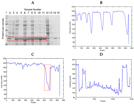 Images of the SDS-PAGE gels, revealed with Coomassie blue, were analyzed using the intensity profile as shown in Figure 4. The gel image in Figure 4A includes samples of GPN protein at different concentrations (lanes 2 to 11 enclosed in a red box). Preliminary analyses were performed on the image to verify whether the intensity profile plots can detect the presence of the protein and its overexpression. Figure 4B shows the intensity profile of the molecular weight control or ladder (lane 1, Figure 4A). The minimum values of the graph coincide with the position of the protein bands of lane one or the control sample, which is used to determine the molecular weight of the samples analyzed in the rest of the gel. Figure 4C shows the intensity profile of lane 4, where the minimum enclosed in a red box indicates the presence of the protein with the highest expression or concentration within the lane. Finally, Figure 4D shows the intensity profile of the region containing the GPN protein at different concentrations (graph corresponding to the proteins enclosed in the red box in Figure 4A, lanes 2 to 11). The background noise generated by the proteins in the total extract and the different concentrations of GPN in the samples can be seen. The multiple maxima in the graph cannot be related to each different expression of the GPN protein.