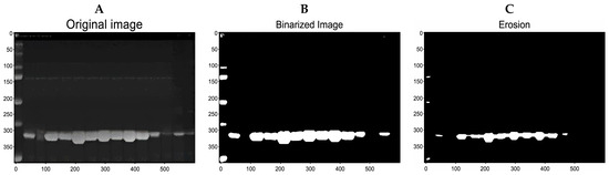 Preprocessing of SDS-PAGE gel images. (A) Grayscale image. (B) Binarized image. (C) Eroded image.