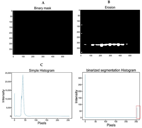 The image from the preprocessing (Figure 5C and Figure 6) was filtered with a binary mask consisting of a matrix of 1 × 400 pixels (Figure 6B). The IPBBIS method was applied, and different binarization techniques such as Niblack, Sauvola, and Otsu were used. There were no significant variations in the obtained results.
