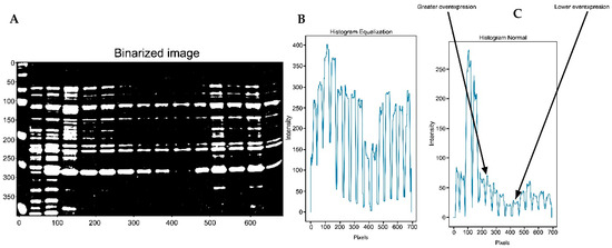 (A) A complete gel is shown. (B) A plot was generated using the image profile based on binarized image segmentation after image equalization. (C) The IPBBIS plot was obtained from the non-equalized Figure 6A.