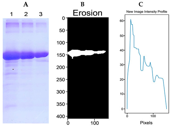 (A) SDS-PAGE gel of BSA protein with the concentrations 2 mg/mL (lane 1), 1 mg/mL (lane 2), and 0.5 mg/mL (lane 3). (B) Image of binary, dilated, segmented, and eroded (A). (C) Plot of the new intensity profile of the (A) gel using IPBBIS.
