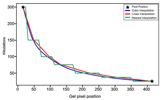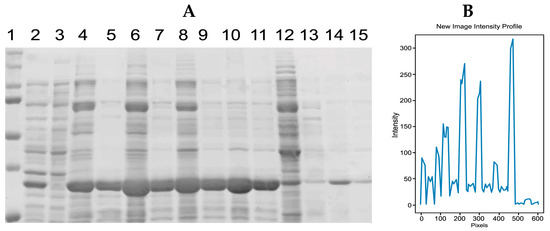 Interpretation of the “new image profile”: For the analysis of the full SDS-PAGE image, the multiple minimum values present in the new image profile are related to the separation between every lane of the gel image. In this region, the number of white pixel values in the array obtained decreases, which helps find the number of lanes in the image. On the other hand, when the analysis was performed for each lane, the multiple maximum values of the new profile of the image were related to the position of the proteins, as they are represented in white. Places of maximum intensity represent the presence of proteins, and places of lower intensity represent the absence of proteins (between two protein separations, the average was calculated to obtain a single maximum), as shown in Figure 3.