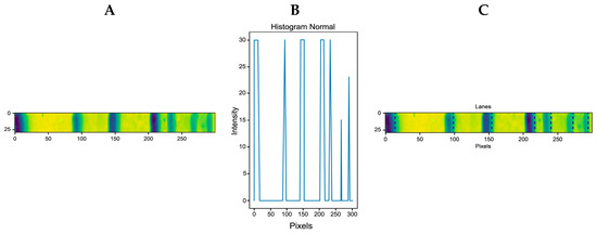 By calculating the histogram in the lane region covered by the binary mask (MAXWIDE = 1 × MAXHIGH = 400, for complete gel analysis or MAXWIDE = 1 × MAXHIGH = 50, for band analysis), the pattern in Figure 6C was obtained, which shows the distribution of the pixels. On the other hand, by performing the binary segmentation of the same region (inside the mask), the histogram shown in the graph in Figure 6D was generated. As the image is binarized, this pattern only shows the maximum intensity values for black (pixel 0) and white (pixel 255). The number of white pixels is stored in an array with all gel values selected by the binary mask.
