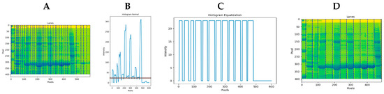 IPBBIS. (A) Binarized and eroded image. (B) Representation of the binary mask with a size of 1 × 400 pixels placed at pixel 7. (C) A simple histogram of the region contained in the binary mask, (D) Histogram of the region after applying Otsu segmentation to (C).