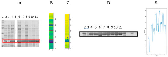 (A) SDS-PAGE gel containing GPN protein expressed at different concentrations. Lane 1, molecular weight control; lanes 2–11, GPN at the following concentrations: 2.0, 0.0, 14.5, 9.5, 27, 18, 30, 18.5, 26, and 14 µg/mL, respectively. (B) The intensity profile of lane 1 of (A) (weight control). (C) The intensity profile of lane 4 for (A). (D) The intensity profile of the bands for the recombinant GPN protein region, highlighted in red from the gel in (A).