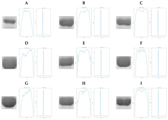 Once the positions separating the samples in the gel were detected (Figure 14B), the molecular weight of the GPN protein and its place within the gel (Figure 14C) were identified, then the region of interest (ROI) that included the expression of the recombinant protein at different concentrations from all samples (red box in Figure 14A including lanes 2 to 11) was selected and isolated as shown in Figure 14D. Analysis was then performed to compare protein overexpression and to identify whether image profiling based on binarized image segmentation can detect proteins with higher or lower overexpression. Before this, the image color in Figure 14D was changed from RGB to HSV. The result is shown in Figure 14E, where the height of the peaks is related to the level of overexpression of the protein analyzed. Every sample with protein contained in the region of interest (ROI) in Figure 14D (lanes 2, 4, 5, 6, 6, 7, 8, 9, 10, and 11) was isolated to obtain a higher precision in the analysis. IPBBIS was applied separately to obtain one graph per sample, as shown in Figure 15. The average of the multiple maxima obtained was calculated to produce a single maximum value per sample (Figure 15A–I), which was related to the amount of protein concentrated in each of the different samples analyzed; these values were aggregated in Table 4 for future reference (row ROI-GPN Table 4). Image profiling based on binarized image segmentation was applied to each of the nine samples containing GPN protein at different concentrations in the ROI region of interest gel in Figure 14D. As shown in the Table 4, we obtained additional data by analyzing the different samples at different concentrations of recombinant GPN protein distributed on the polyacrylamide gel in Figure 14D.