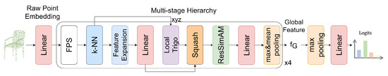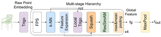 The nonparametric modeling of point cloud classification method known as Point-Sim is shown in Figure 1. In the classification model, nonparametric feature embedding is first performed using trigonometric functions(the Trigo block). Subsequently, in the hierarchical feature extraction stage, the centroids are selected using FPS, and from these centroids, the point clouds are grouped using k-NN. We apply trigonometric functions to map the local geometric coordinate. In order to better match the feature naive similarity, the geometric and local features are added and fed into the Squash block, the features are squeezed to make them smoother, and then the smoothed features are fed into the ResSimAM block so that the model can pay better attention to the features with higher energy; this improves the classification ability of the encoder, and then finally the global features are obtained by using the pooling operation.