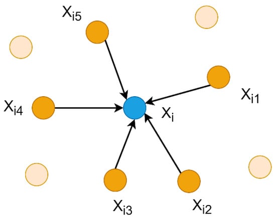 K-nearest neighbors of point . Where represents the center point of the local region, , , …, represent the nearest neighbors of , and the rest of the points are not included in the local region.