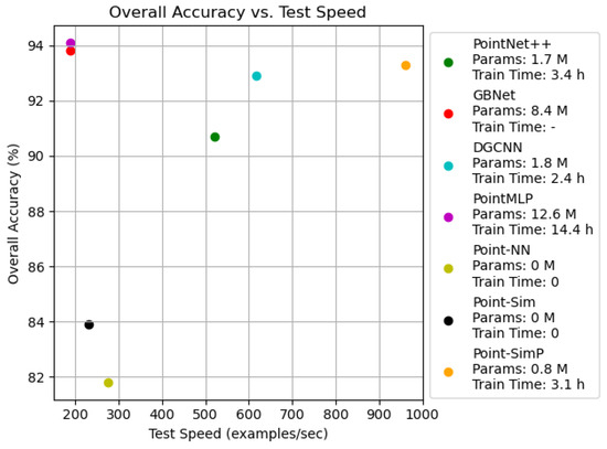 Our results are visualized on the ModelNet40 dataset, and the results are shown in Figure 6. For the nonparameterized model Point-Sim, the model OA was improved compared to Point-NN with similar inference speed. For the parameterized model Point-SimP, it was able to greatly improve the inference speed while maintaining the accuracy and had an advantage in the network training time.