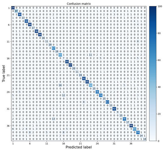 We generated a 40 × 40 confusion matrix for our classification results, and the results are shown in Figure 7, in which there are 40 categories, with the horizontal axis representing the predicted labels and the vertical axis representing the ground truth labels (including airplane, bathtub, bed, bench, etc.). By visualizing the confusion matrix, we can see that most of the categories were classified well; for example, all the classifications on label 1 (airplane) and label 19 (keyboard) are correct, but the accuracies on label 16 (flower pot) and label 32 (stairs) still need to be improved. Figure 8 shows some representative results on ModelNet40.