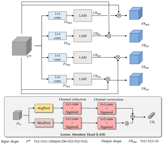 Specifically, the LPB performs element-wise addition on the output from the MSAB to generate . is then passed through four parallel convolutional layers with a kernel size of 1 × 1 to reduce the channel dimension, resulting in four types of lesion features, , . Afterwards, is passed to LAH, where specific channel attention factors , are generated to emphasize the unique channel information for each lesion type. The mathematical process of the LAH can be described as follows: