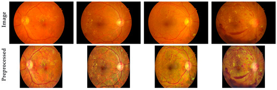 Considering that the contrast between lesion areas and normal tissues in retinal fundus images is often imperceptible, it is difficult to distinguish between them with the naked eye and automated DR diagnosis based on deep learning [30]. Therefore, many methods [31,32] employ various techniques to highlight the lesion areas in the images before performing DR diagnosis, assisting the network to better process the images. Following the above-mentioned methods, this paper applies the following preprocessing steps to the DDR dataset, DIARETDB1 dataset, and IDRiD dataset: First, the black borders are cropped to reduce computation time and suppress irrelevant noise information. Then, the images are uniformly resized to 512 × 512 dimensions. Contrast Limited Adaptive Histogram Equalization (CLAHE) [33] is applied to enhance the images, with the processing parameters set as ClipLimit = 2 and GridSize = 8. Finally, the image pixel values are normalized from 0~255 to 0~1 for subsequent network processing.