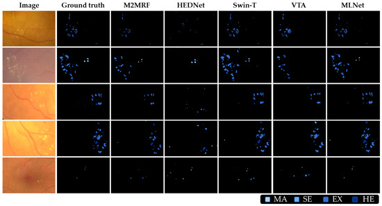 To visually illustrate the effectiveness of MLNet in DR lesion segmentation, this paper selects five representative DR images and corresponding ground truth and presents the visual results of five different DR lesion segmentation methods, including MLNet, as shown in Figure 5.