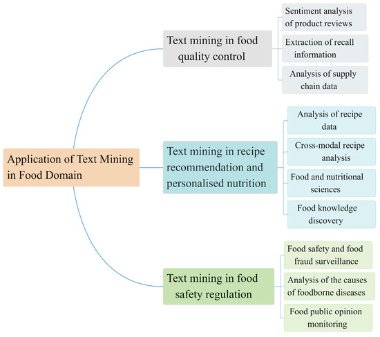 Meanwhile, the rapid development of text mining methods [2,3] makes it possible to deeply analyze the rich semantic information contained in the content of the text. It is used in various areas, especially in the food industry, where it plays an important role in analyzing food quality [4], providing gastronomic recommendations [5], warning about food safety issues [6,7], and creating regulations for food security [8], among other things. Specifically, the work in [9] monitored food quality and safety issues based on user-generated content for timely corporate response. The work in [10] utilized big data to provide a comprehensive examination of the entire food supply chain, thereby increasing synergies and efficiencies throughout the supply chain and beyond. The work in [11] performed semantic analysis of food products based on reviews and menu descriptions, providing a way for users to discover their favorite dishes based on personal preferences and descriptions. Recommendation systems [12,13,14] use text mining techniques to provide guidance on healthy dietary choices, as well as to customize recipes based on individual and group preferences. These examples highlight the potential effectiveness of text mining in providing intelligent decision support in the food domain.