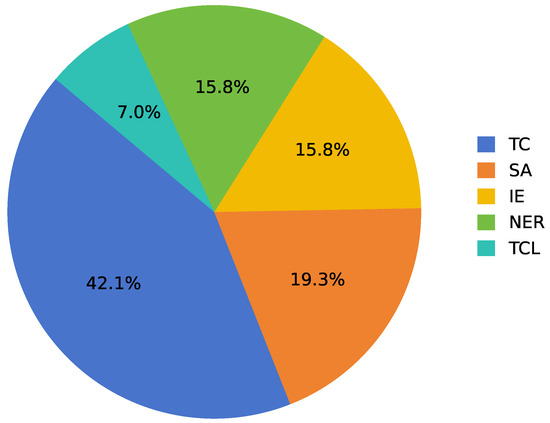 Number of papers, where TC = text classification, SA = sentiment analysis, IE = information extraction, NER = named entity recognition, and TCL = text clustering.