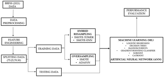 Specifically, we explore the efficacy of two oversampling techniques (SMOTE and ADASYN) and two hybrid resampling algorithms (SMOTE-Tomek and SMOTE-ENN) alongside six ML models (logistic regression (LR), decision tree (DT), random forest (RF), gradient boosting (GB), XGBoost classifier (XGB), and CatBoost) complemented by the application of an ANN.