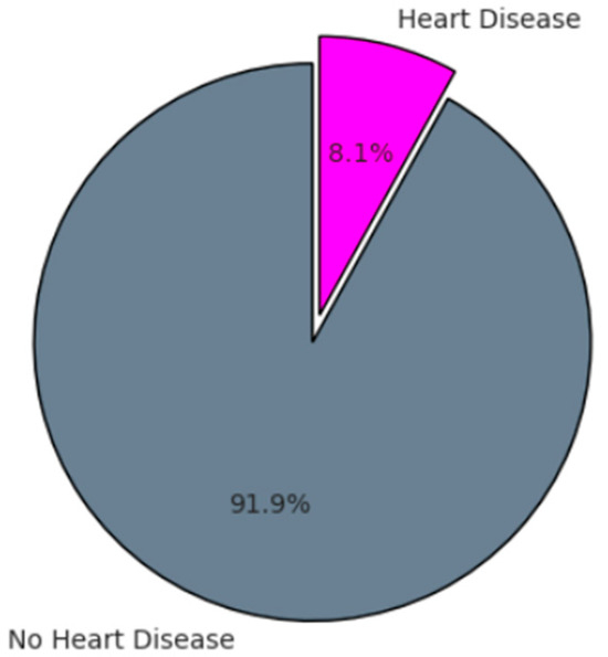 Furthermore, gaining precise insights into the distribution of the target variable within the dataset is imperative. Our analysis of the BRFSS data unveiled a notable class imbalance, as depicted in Figure 2. Merely 8.1% of the surveyed population reported a diagnosis of heart disease, accentuating the challenge of class imbalance in our modeling endeavors. Such imbalance may predispose the model towards the majority class of non-CVD cases, potentially compromising its efficacy in identifying high-risk patients. Addressing this imbalance is paramount to mitigating bias and enhancing model performance in risk prediction.