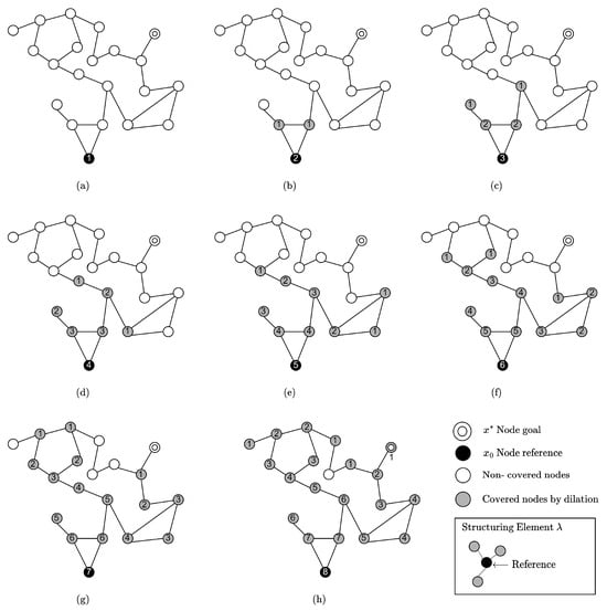 - Base case: Consider that D becomes reachable in one step forward by the dilation-induced lattice. Algorithm 2 reduces to the one-time application of the dilation operator. Let , and ; this is true. If the intersection is the empty set, D is not reachable in one step. Consequently, this is the minimum path step forward in the lattice. Considering that the solution might not be unique, one or more nodes in one step forward reach the destination.
