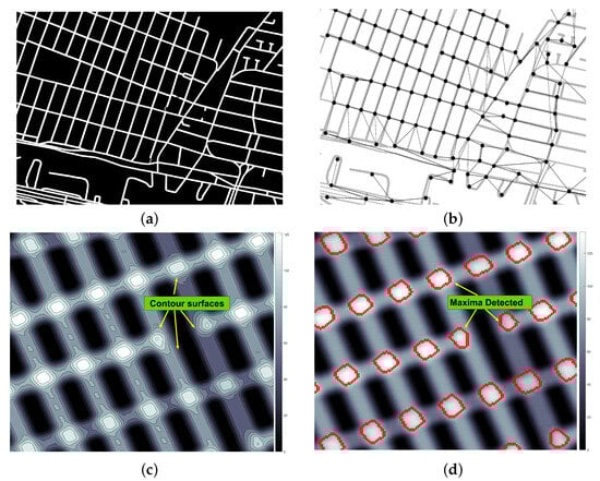 - The location of the best trajectory from a graph space. In this stage, the city is encoded as a graph after computing the avenue intersections as nodes. The tested scenario becomes the same as that used in the last point. The weighting considers the distance in a metric space to weigh the graph. The coding process uses the vertex detection since the detection of the maximum values of the distance transformation is given by the segmentation of the road into a connected map. All maxima detected represent the nodes, and the connection arcs result from the connected avenues. Each vertex represents an avenue intersection.