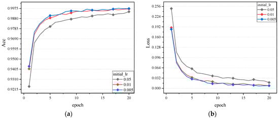 Performance comparison of the MNIST dataset for different learning rate variation intervals: (a) comparison of accuracy; (b) comparison of loss values.