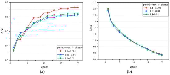 Comparison of the performance of the CIFAR10 dataset for different learning rates in terms of maximum change and cycle length: (a) comparison of accuracy; (b) comparison of loss values.