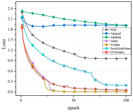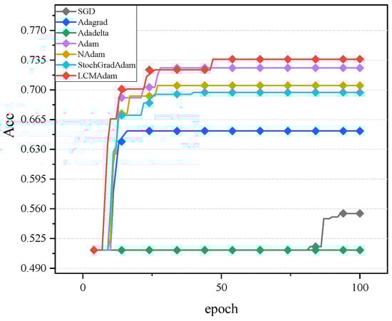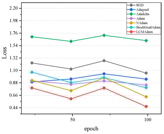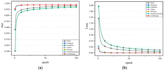 In order to comprehensively assess the performance advantage of the LCMAdam algorithm over other optimization algorithms, a series of classical optimization algorithms were selected for comparative experiments (the initial conditions were the same for each experiment, and the comparison was only the difference in the accuracy and loss values between the different algorithms), including SGD, Adagrad, Adalelta, Adam, Nadam, and StochGradAdam. Multiple experiments were conducted with different datasets and learning rate conditions to comprehensively evaluate their performance. The comparison of the experimental results of different optimization algorithms is shown in Table 3.