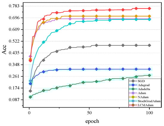 The results in Figure 4 show that, on the CIFAR10 dataset, although the accuracy of the LCMAdam algorithm is slightly lower than that of the Adam and NAdam algorithms at the beginning of the training period, the accuracy of the LCMAdam algorithm surpasses that of the remaining six algorithms as the training progresses, and the algorithm improves its accuracy by 6.71% compared to the Adam algorithm. The accuracy of the LCMAdam algorithm is improved by 5.35% and 6.14% compared to the improved Adam algorithm-based NAdam algorithm and StochGradAdam algorithm, respectively. This advantage can be attributed to the curvature-controlled gradient strategy employed by the LCMAdam optimizer. During the training process, the LCMAdam algorithm ensures the smoothness of the gradient update by limiting the curvature of the gradient. By adjusting the change in the size of the curvature, the LCMAdam algorithm can effectively avoid drastic fluctuations in the gradient, thus improving the stability of model training.